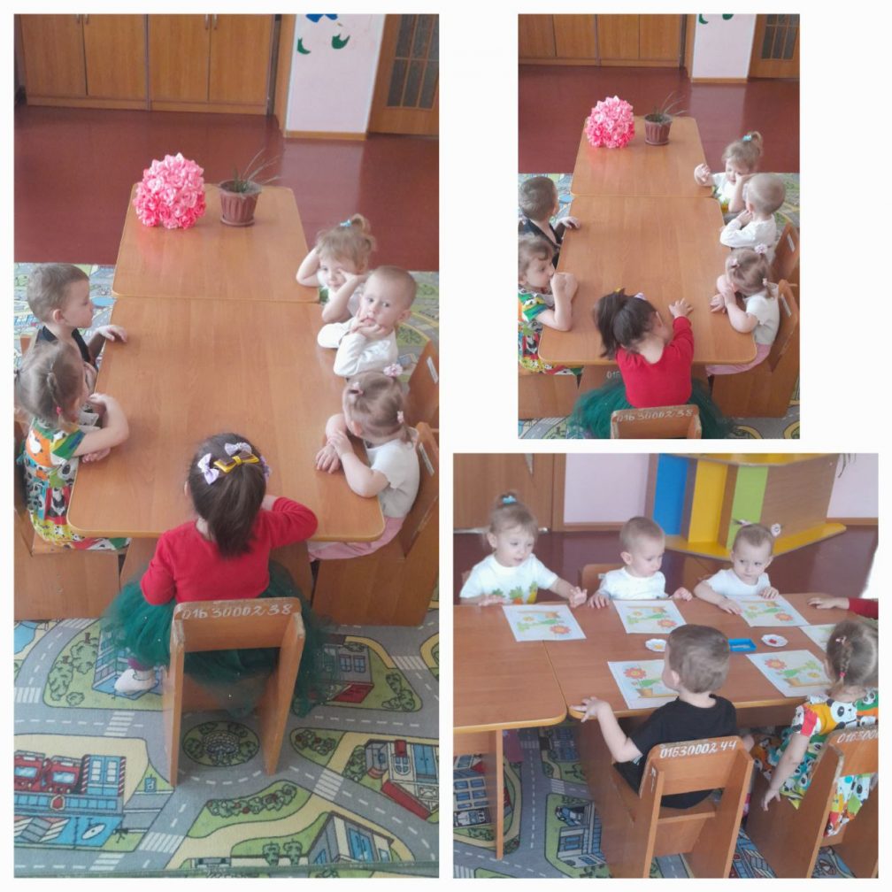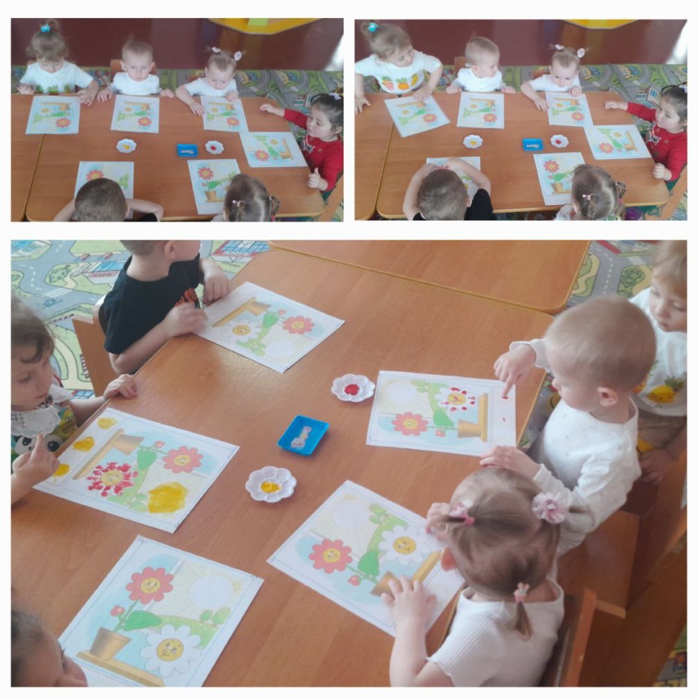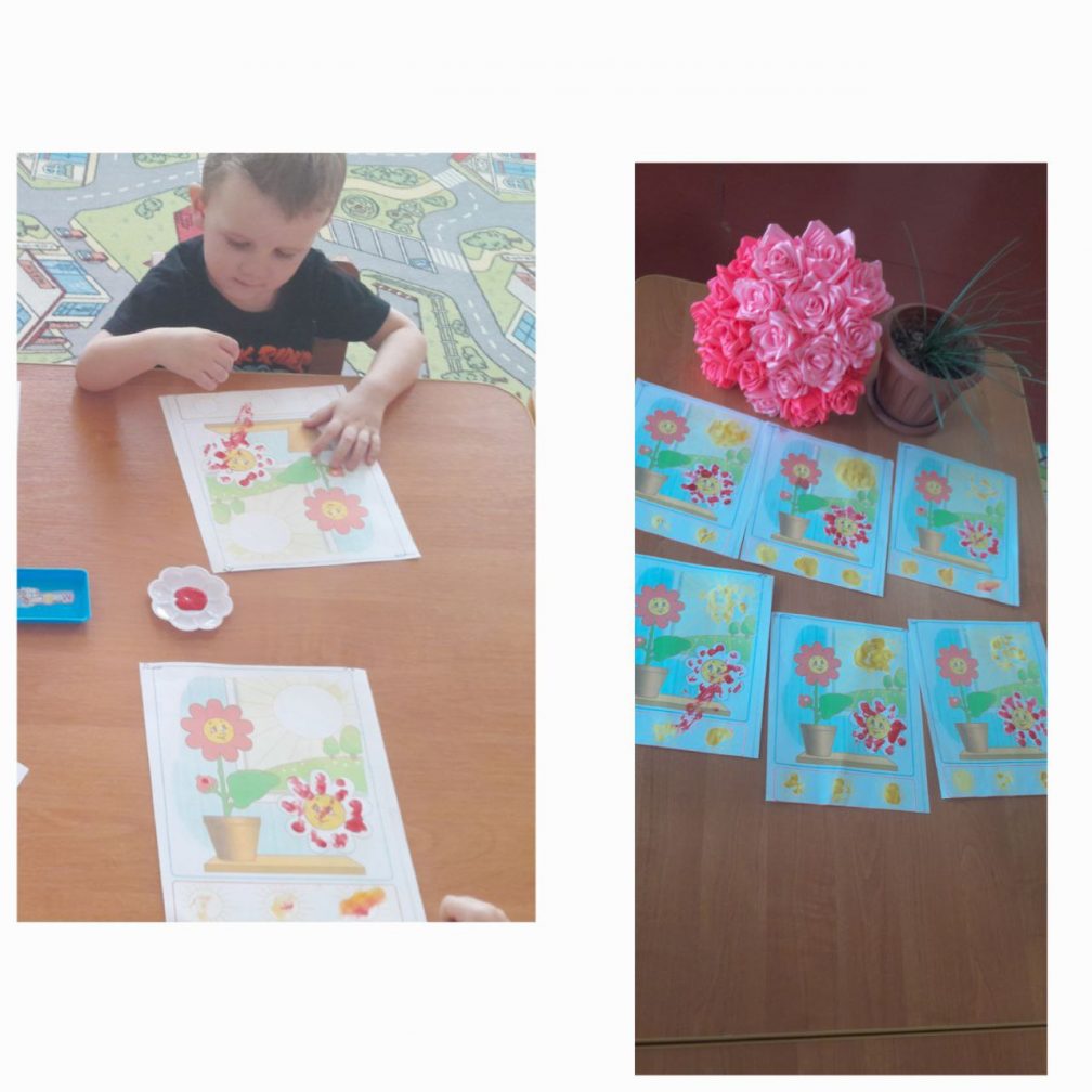 Мақсаты: балаларды қызыл бояуды қолдана отырып, гүл жапырақшаларына саусақ іздерін қоюға үйрету.